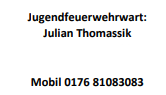 Für Auskünfte zu den Diensten und allen Fragen rund um die Jugendfeuerwehr steht unser Jugendfeuerwehrwart Julian Thomaasik gerne zur Verfügung.